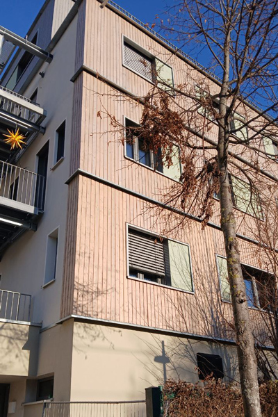 Um die Baugruppe bei der Entscheidungsfindung zu unterstützen, welche recycelten Materialien für die Fassade in Frage kommen, testen wir eine favorisierte Kombination aus recycelten Schalhäuten, die im Normalfall für das Gießen von Betonwänden- und decken genutzt werden, sowie Latten aus Thermokiefer, die der Fassade eine dominante, vertikale Struktur geben sollen. Wie wirkt sich beispielsweise die Sonneneinstrahlung auf die optische Erscheinung der dunklen Schalhäute aus?